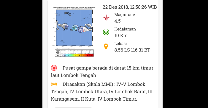 Melalui Website resmi BMKG merilis, Gempa Bumi 4,5 Magnitudo itu terjadi pada 22 Desember 2018, Pukul 12:58:26 WIB, dengan kedalam 10 Km, Lokasi 8.56 LS 116.31 BT dan Pusat gempa berada di darat 15 km timur laut Lombok Tengah, NTB.
