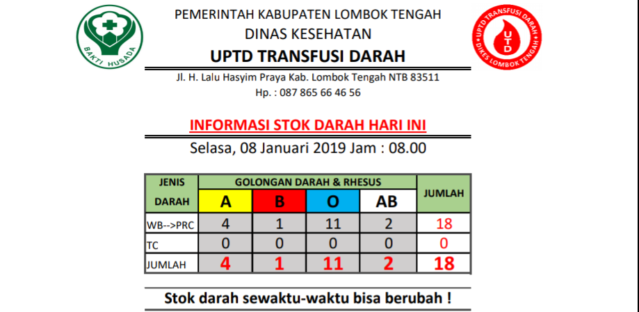 Update Stok Darah di UTD Dikes Lombok Tengah Hari Ini