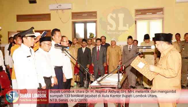 SUARALOMBOKNEWS.com - Lombok Utara | Bupati Kabupaten Lombok Utara, Nusa Tenggara Barat (NTB) Dr. H. Najmul Akhyar, SH. MH melantik dan mengambil sumpah jabatan 133 penerima mandat pada jabatan Pimpinan...
