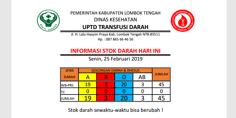 Update Stok Darah di UTD Dikes Lombok Tengah Hari Ini
